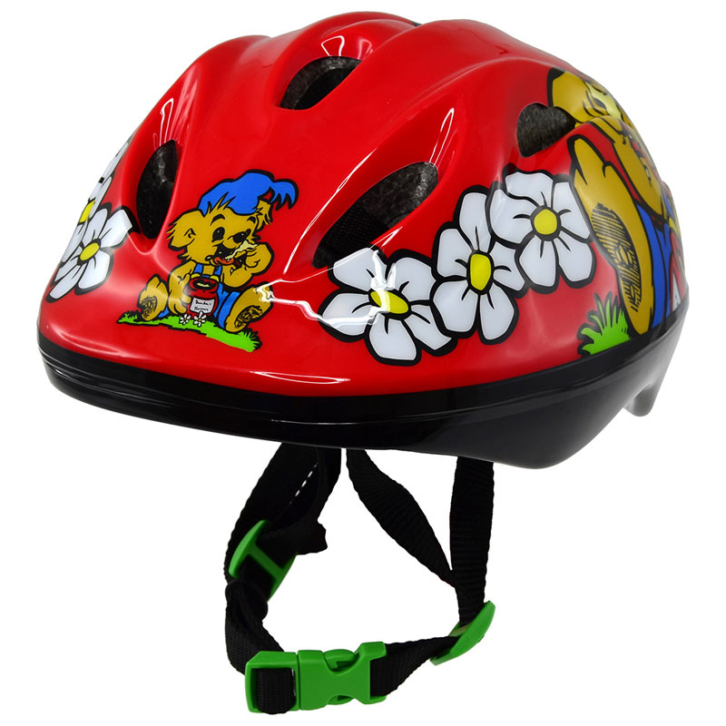 Härlig cykelhjälm från Nordic Hoj, prydd av ett lekfullt Bamsemotiv mot en röd botten.