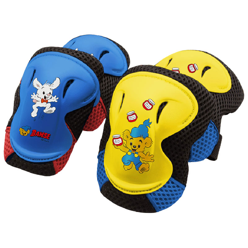 Klassiska knä- och armbågsskydd från Bamse, med motiv av Bamse och Lille Skutt mot en blå respektive gul botten.