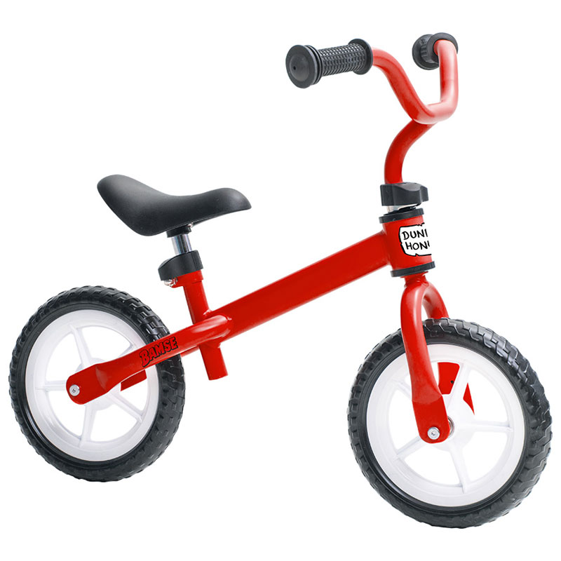 Häftig 10" springcykel från Nordic Hoj, i klarröd nyans med texten "dunder honung" längst fram.