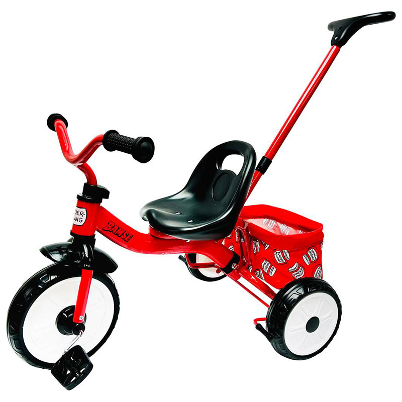 Utrustad med bland annat avtagbar föräldrarstång, tygkorg med Bamsemotiv och tysta hjul i massiv EVA.