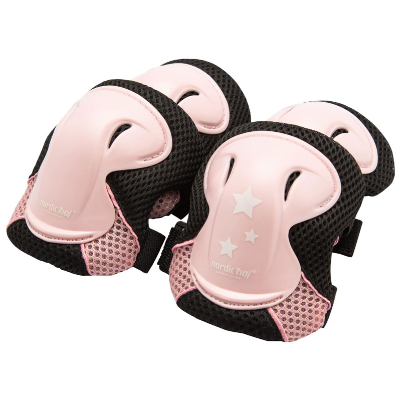 Klassiska knä- och armbågsskydd från Nordic Hoj, i en fin rosa nyans med vita stjärnor.