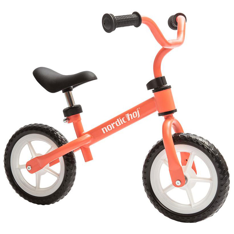 Snygg 10" springcykel från Nordic Hoj, i en härligt aprikosfärg med handtag och sadel i svart.