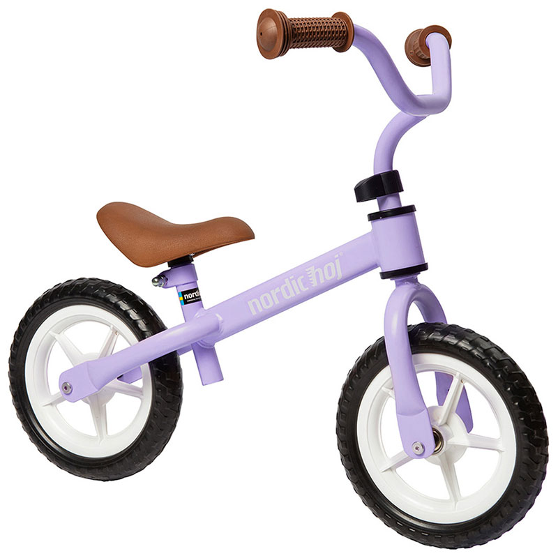 Snygg 10" springcykel från Nordic Hoj, i en härligt lila nyans med handtag och sadel i brunt.