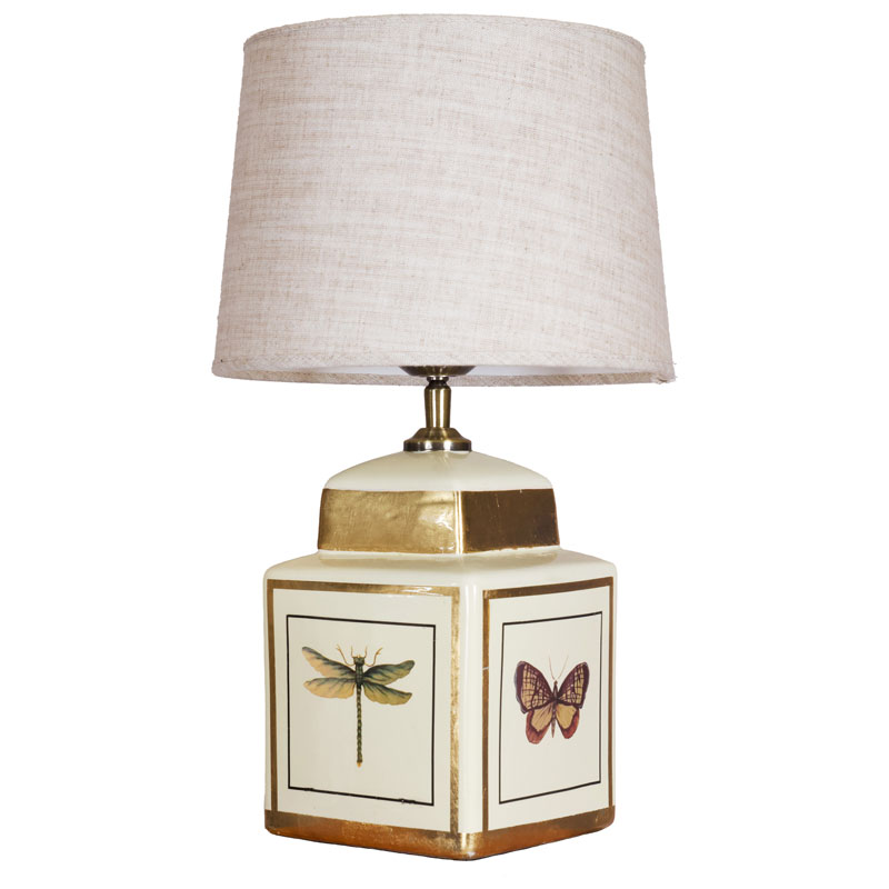 Denna dekorativa bordslampa ger konstnärlig charm i ett mindre format, från PR Home. En keramisk bas i en mjuk gul nyans, prydd med handmålade pastelfärgade fjärilar och skimrande guldaccenter.