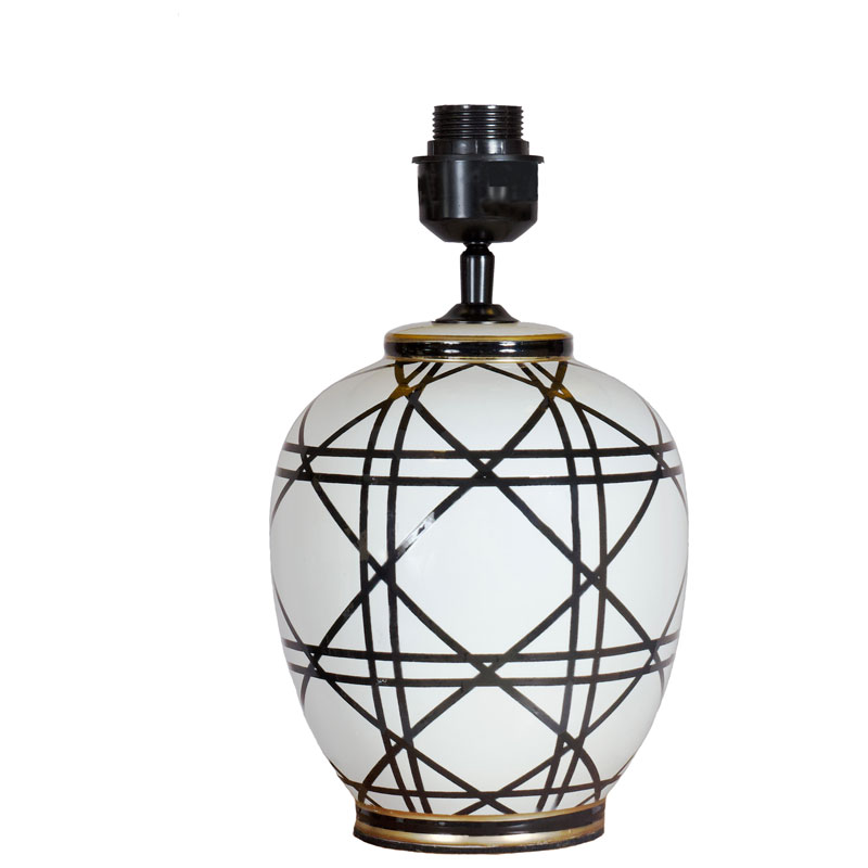 Denna bordslampa från PR Home är verkligen ett iögonfallande föremål som omedelbart drar blickarna till sig. Med en läcker vit keramiskfot, prydd med ett slående svart grafiskt mönster. Fungerar både som ljuskälla och dekorativt konstföremål.