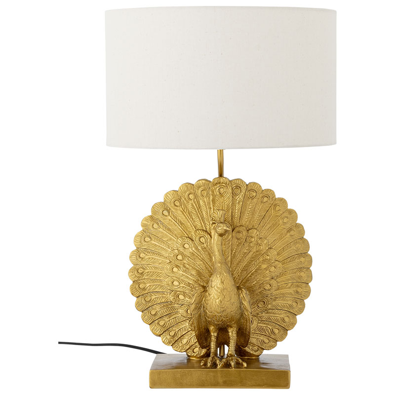 Bordlampan Peacock från Creative Collection är tillverkad av polyresin med en guldfärgad yta och har en skulptural bas som föreställer en påfågel. Lampskärmen i ljus textil skapar en mjuk kontrast och ett behagligt ljus.