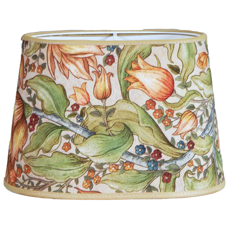 Då lampskärmen är sydd från ett färdigtryckt tyg kan mönsterpassning och motiv variera och avvika från bilden. Tillverkad i tyg som är klätt kring en metallställning med vit insida.