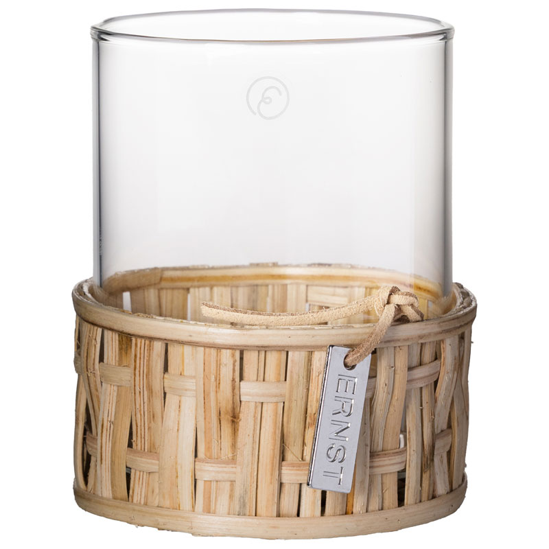 Multifunktionell ljuslykta/vas från ERNST, placerad i en stilren vävd korg.