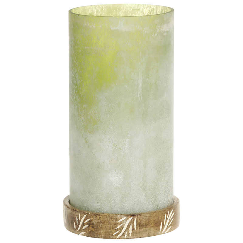 Vacker ljushållare i frostat glas med fat i mangoträ från Chic Antique.