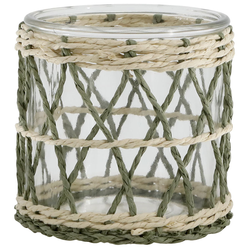 Snygg inredningsdetalj i form av en ljuslykta klädd med flätad jute i grönt och beige.