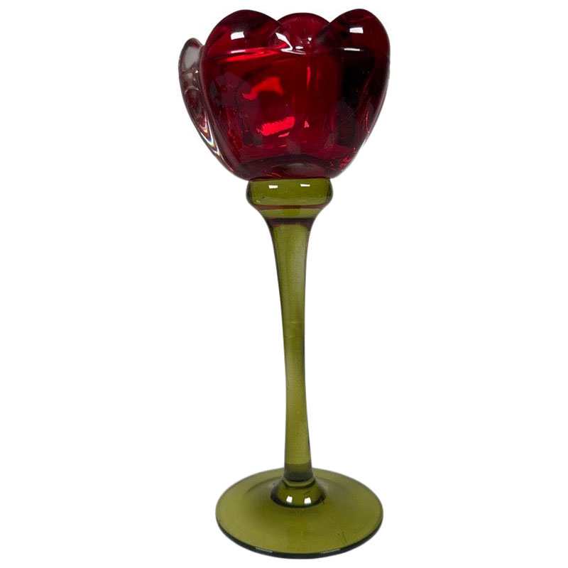 Tjusig ljuslykta från Miljögården, tillverkad i glas med ett vackert motiv av en röd ros.