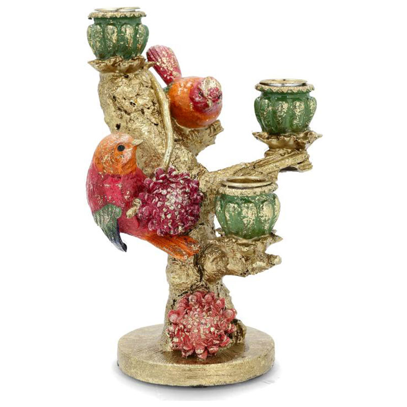 Unik ljusstake för tre ljus, utformad som en gren med färgglada fåglar.