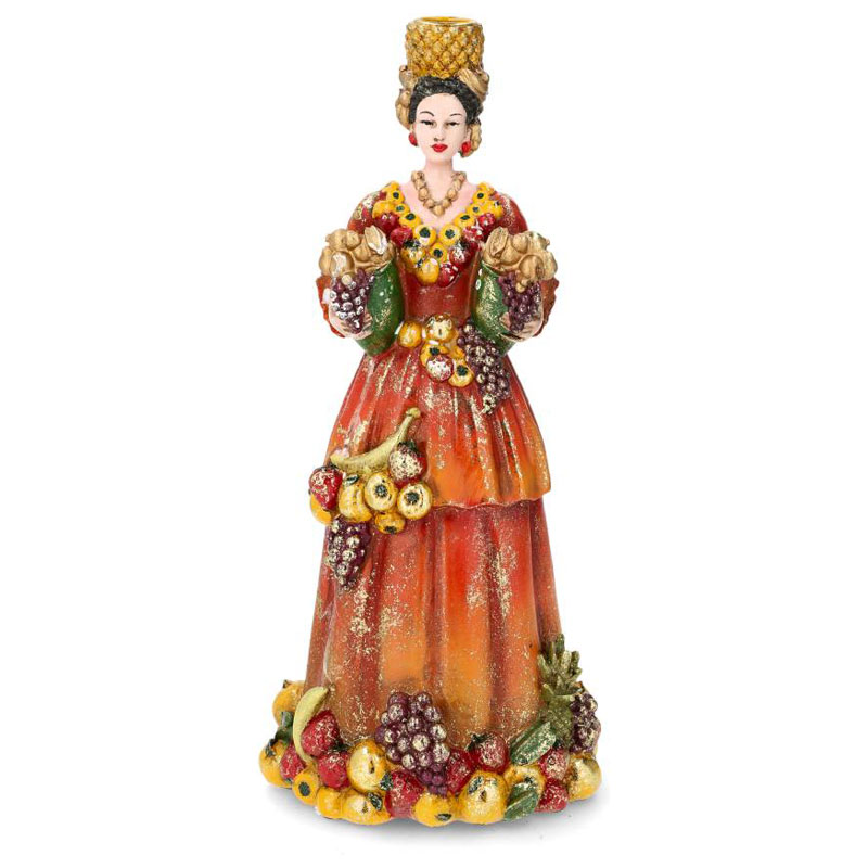 Unik ljusstake från A Lot Decoration, med motiv av en kvinna i en orange klänning prydd av olika frukter.