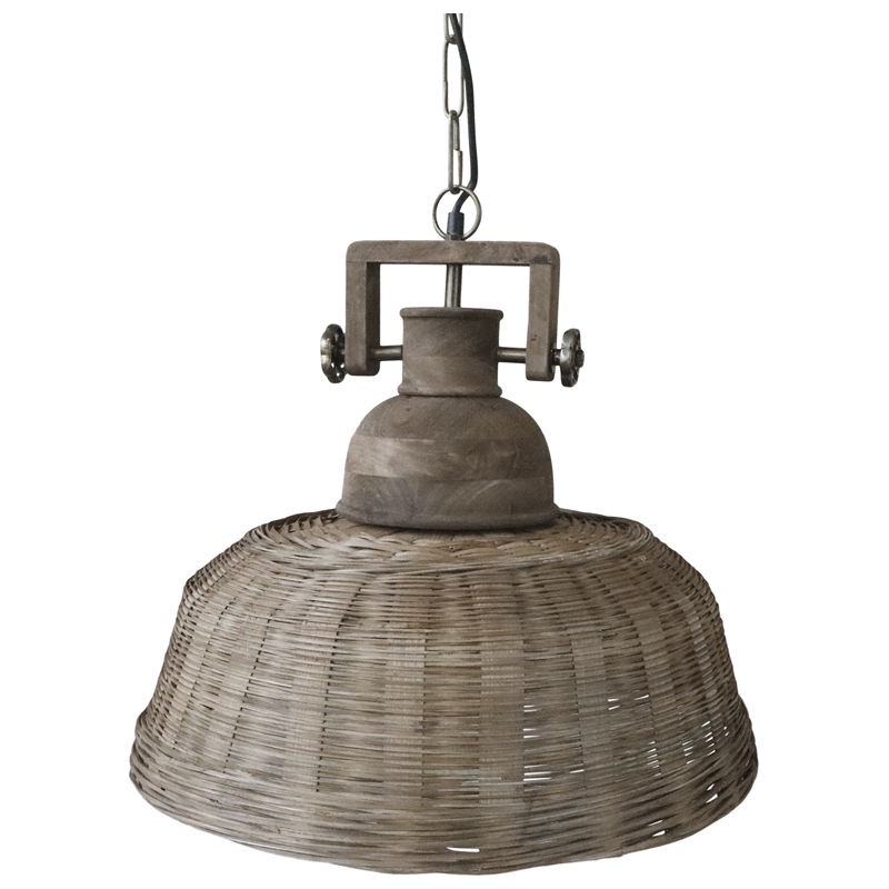 Snygg taklampa med skärm i flätad rotting samt takhänge i mangoträ och järn.