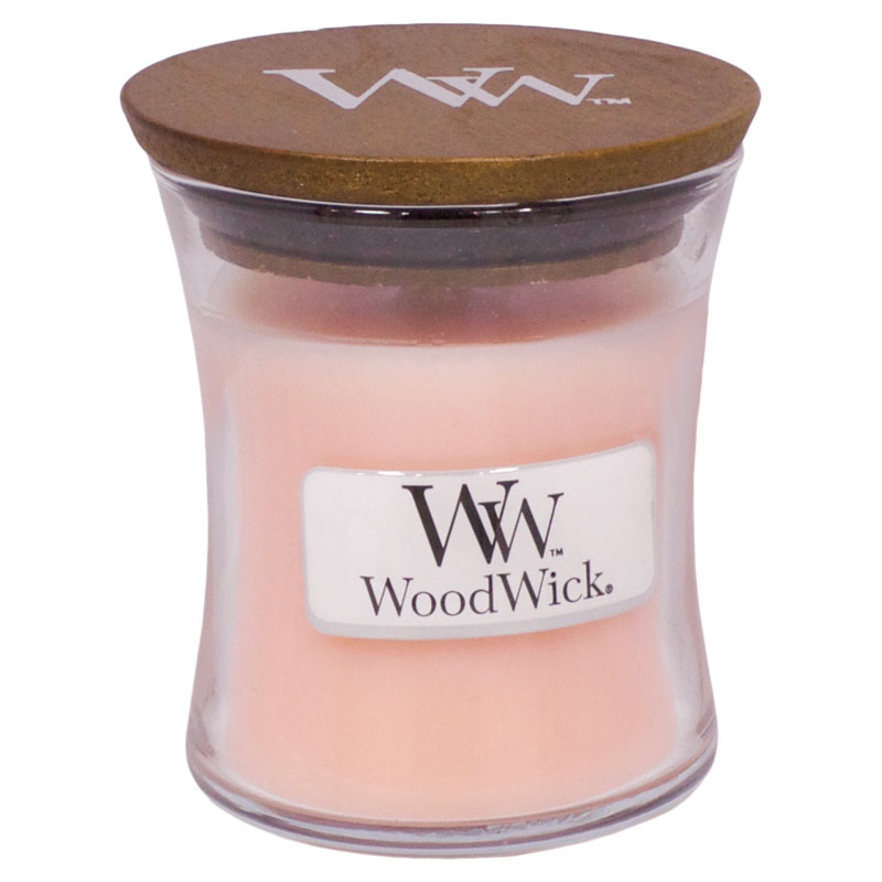 WoodWick Coastal Sunset är ett vackert rosa doftljus med knastrande träveke och en fruktig, somrig doft av kokos.