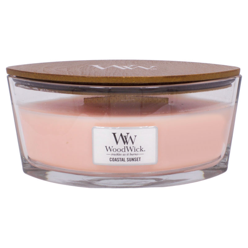 WoodWick Coastal Sunset är ett vackert rosa doftljus med knastrande träveke och en fruktig, somrig doft av kokos.