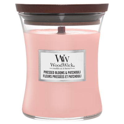 WoodWick Pressed Blooms & Patchouli är ett vackert, rosa doftljus med knastrande träveke och doften av härliga blommor blandat med träig vetiver och patchuli.