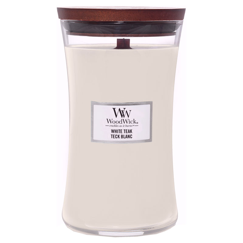 WoodWick Chilli White Teak är ett vackert vitt doftljus med knastrande träveke och en träig doft av balsamgran blandat med sandelträ och ek, med en hint av mossa och ceder.