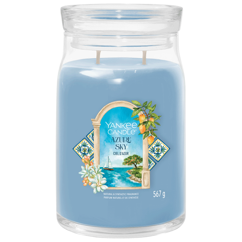 Doftljus från klassiska Yankee Candle® Signature med doften "Azure Sky" - med noter av tidvatten, färsk mango, söt kokosgrädde och soldränkt tuberos. Bara fötter som möter vågskvalp när du promenerar i solen längs den magiskt vackra italienska kusten.