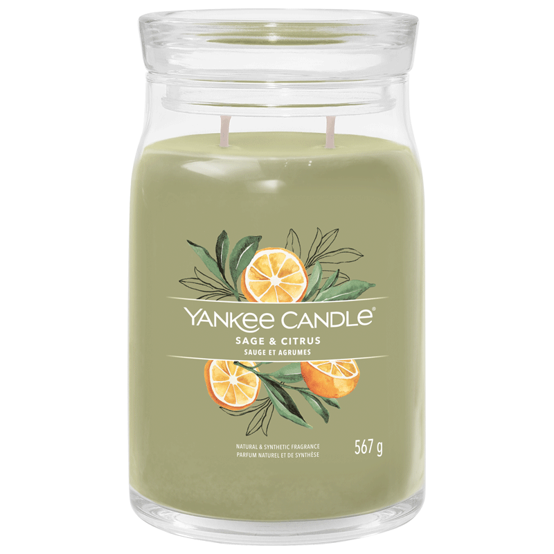 Doftljus från klassiska Yankee Candle® Signature med doften "Sage & Citrus" - en underbart fräsch doft av salvia, citrus, blandade träslag och mysk.