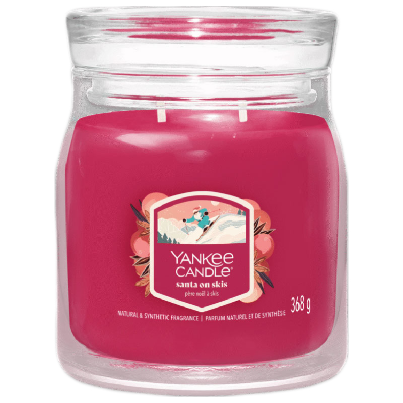 Doftljus från klassiska Yankee Candle® Signature med doften "Santa On Skis" - Tomten är kittad och klar för att attackera backarna. I spåren lämnar ha dofterna av kryddnejlikeknopp, syrliga julbär och vanilj.