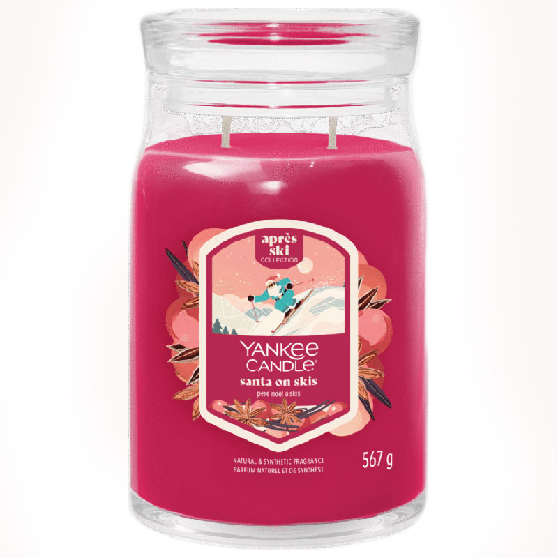 Doftljus från klassiska Yankee Candle® Signature med doften "Santa On Skis" - Tomten är kittad och klar för att attackera backarna. I spåren lämnar ha dofterna av kryddnejlikeknopp, syrliga julbär och vanilj.