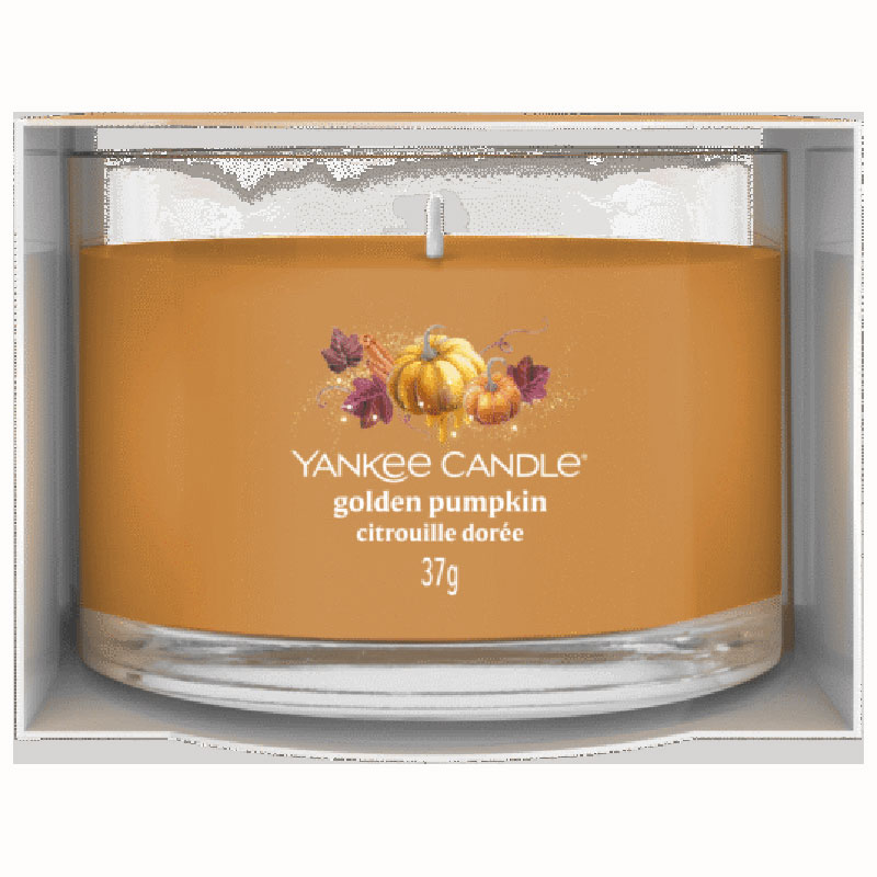 Filled Votive, votivljus i glas från klassiska Yankee Candle® med doften "Golden Pumpkin" - En härlig och höstig doft. Bada i aromer av ingefära, varm kanel och söt karamell med inslag av mogen pumpa som nästan lyser som guld i eftermiddagssolen.
