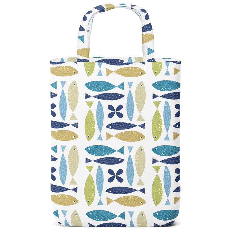 Fina Fisken från Arvidssons Textil är en textilkasse med motiv av fiskar i olika blå nyanser.