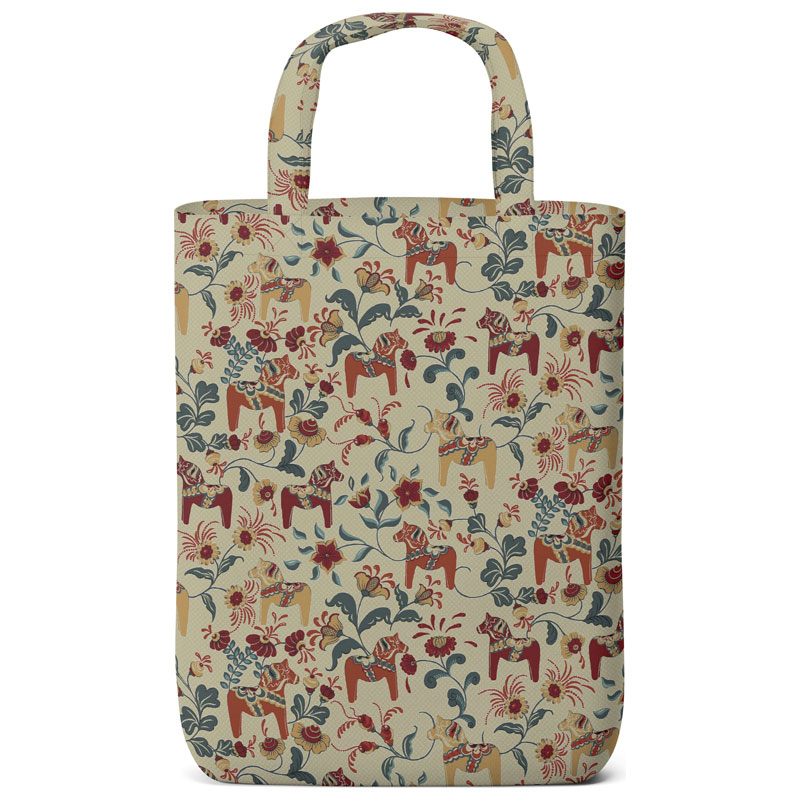 Trevlig tygkasse från Arvidssons med fint kurbitsmönster och dalahästar i färgerna linne och rött med blå inslag mot linnefärgad botten.