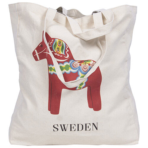 Trevlig tygkasse från Nordic Souvenir, med en dalahäst mot en ljus botten.