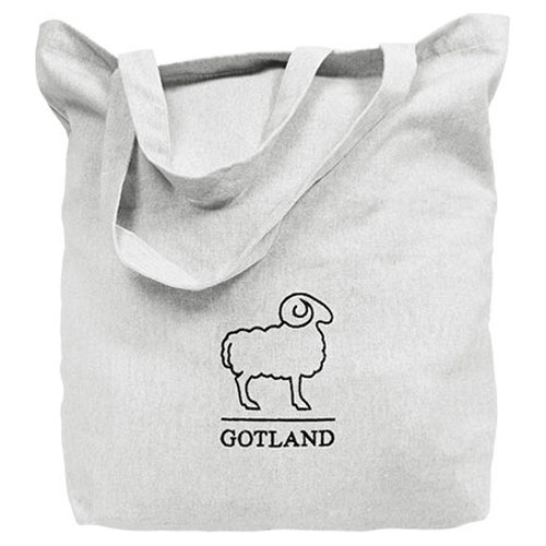 Trevlig tygkasse från Nordic Souvenir, med ett svart motiv av ett gotlandsfår mot en ljusgrå botten.