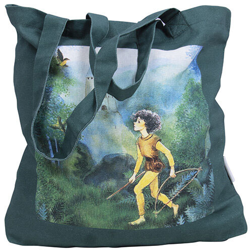 En tygkasse från Nordic Souvenir, med en illustration av Ronja Rövardotter mot en grön botten.