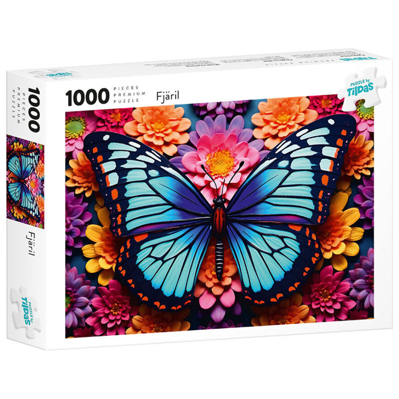 Vackert pussel, med färgglatt motiv av en fjäril mot en blommig bakgrund.