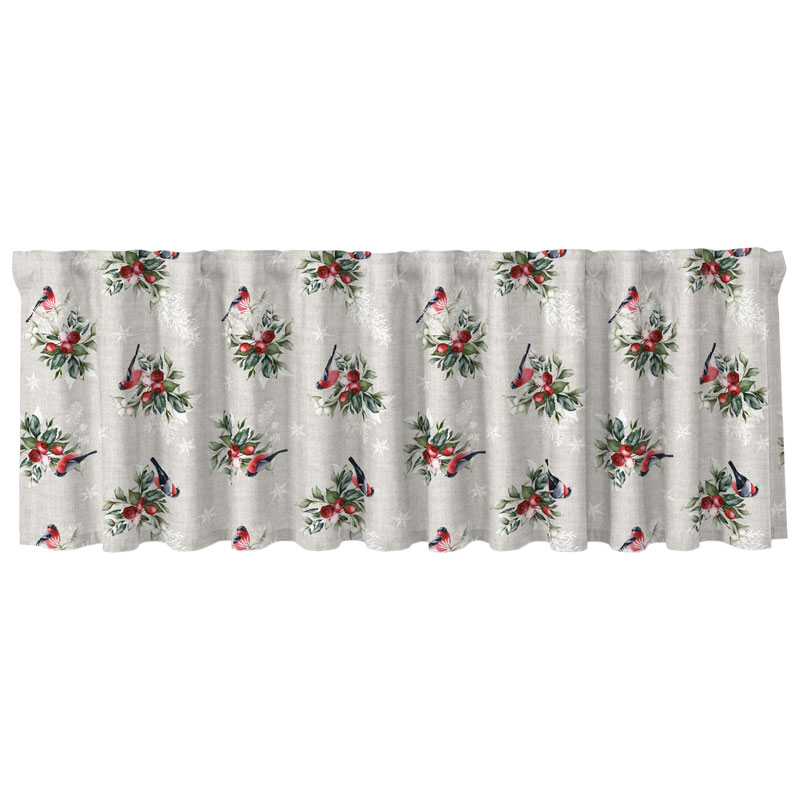 Härlig gardinkappa på metervara från Redlunds, prydd av domherrar och mistlar mot en sandfärgad botten.