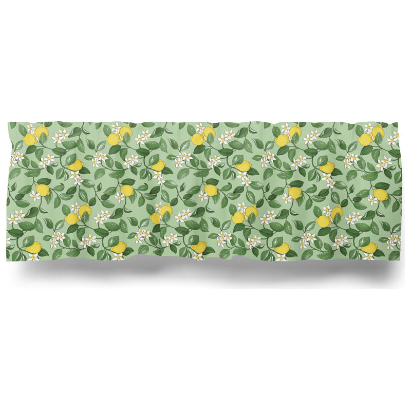 Citronlycka från Arvidssons Textil är en vacker gardinkappa i grönt med motiv av citroner, blommor och blad.