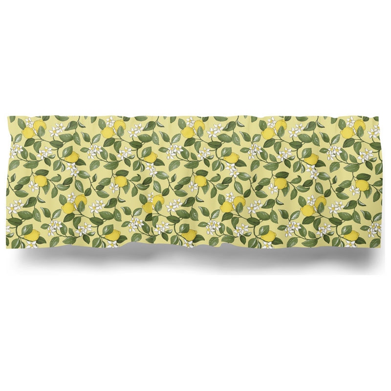 Citronlycka från Arvidssons Textil är en vacker gardinkappa i gult med motiv av citroner, blommor och blad.