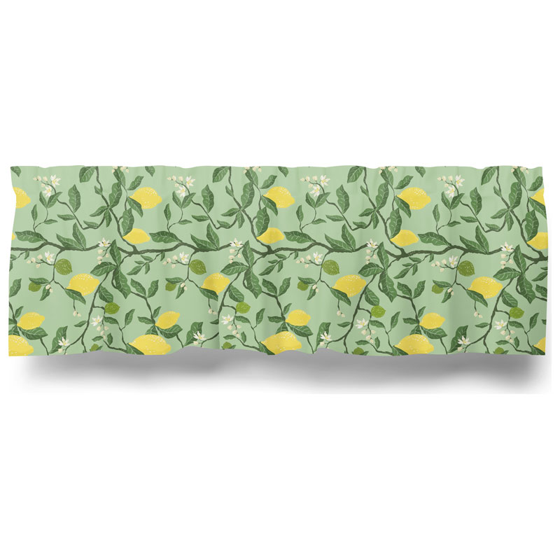 Citronträd från Arvidssons Textil är en vacker gardinkappa i grönt med motiv av citroner, blommor och blad.