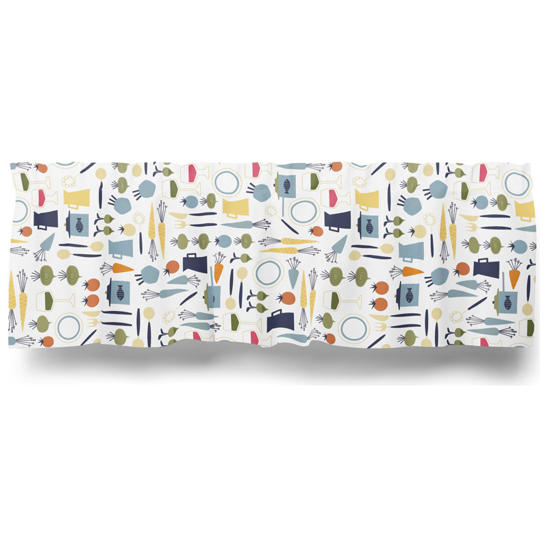 Dinner från Arvidssons Textil är en söt gardinkappa i vitt med motiv av grönsaker, rotfrukter och köksredskap. Säljs som metervara.