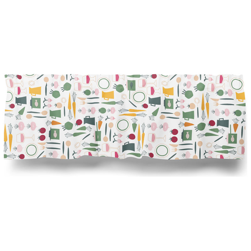 Dinner från Arvidssons Textil är en söt gardinkappa i vitt med motiv av grönsaker, rotfrukter och köksredskap. Säljs som metervara.
