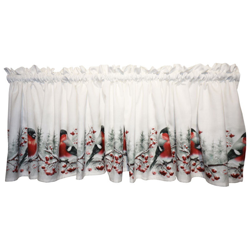 Vacker gardinkappa från Redlunds, prydd av ett digitaltryckt motiv av domherrar i vinterlandskap.