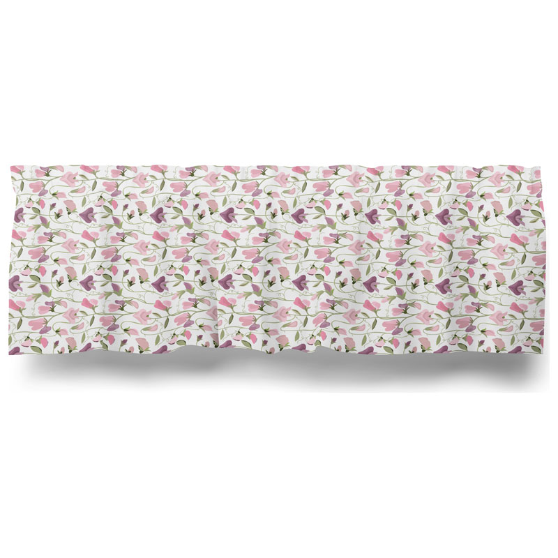 Ljuvlig gardinkappa från Arvidssons Textil med motiv av rosa luktärt på en vit botten.