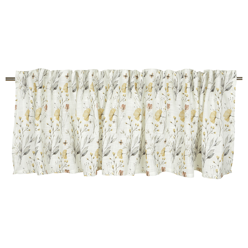 Lykke är en vacker gardinkappa med blommönster mot en offwhite botten, en livfull inredningsdetalj som ger rummet en varm touch.