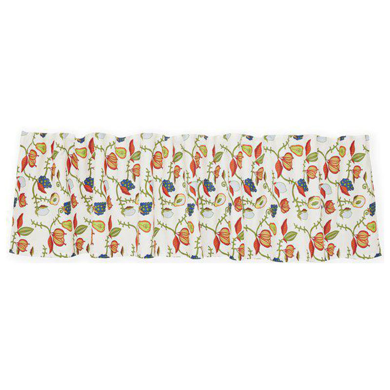 Livfull gardinkappa som sprakar av ett lekfullt mönster med slingrande rankor, frökapslar och bär i klara nyanser av rött, blått och grönt.