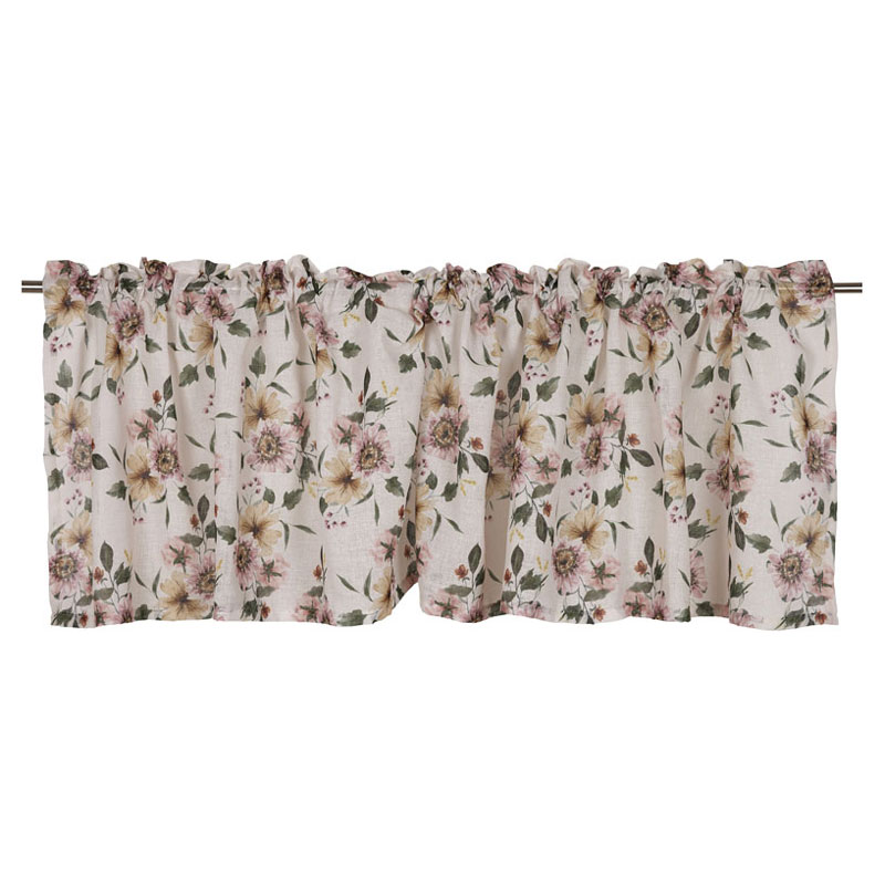 Olivia från Fondaco, skir gardinkappa prydd med ett vackert, blommigt mönster i rosa och beige på en sandfärgad bakgrund.