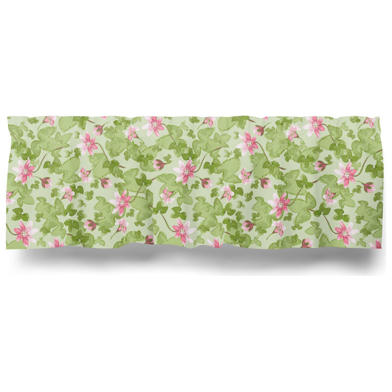 Sippa från Arvidssons Textil är en grön gardinkappa med gulligt, rosa blommönster. Säljs som metervara.