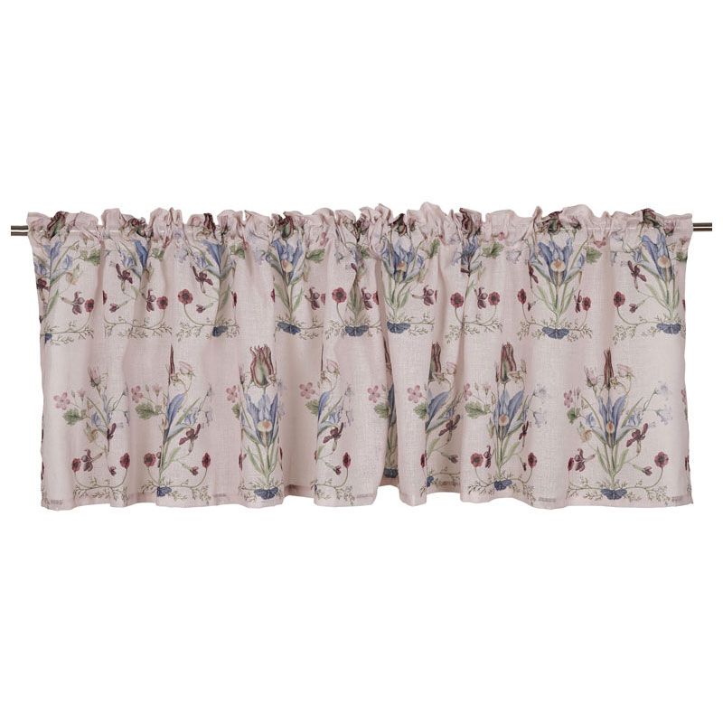 Vendela från Fondaco, skir gardinkappa med ett romantiskt, blommigt mönster på en ljusrosa bakgrund.
