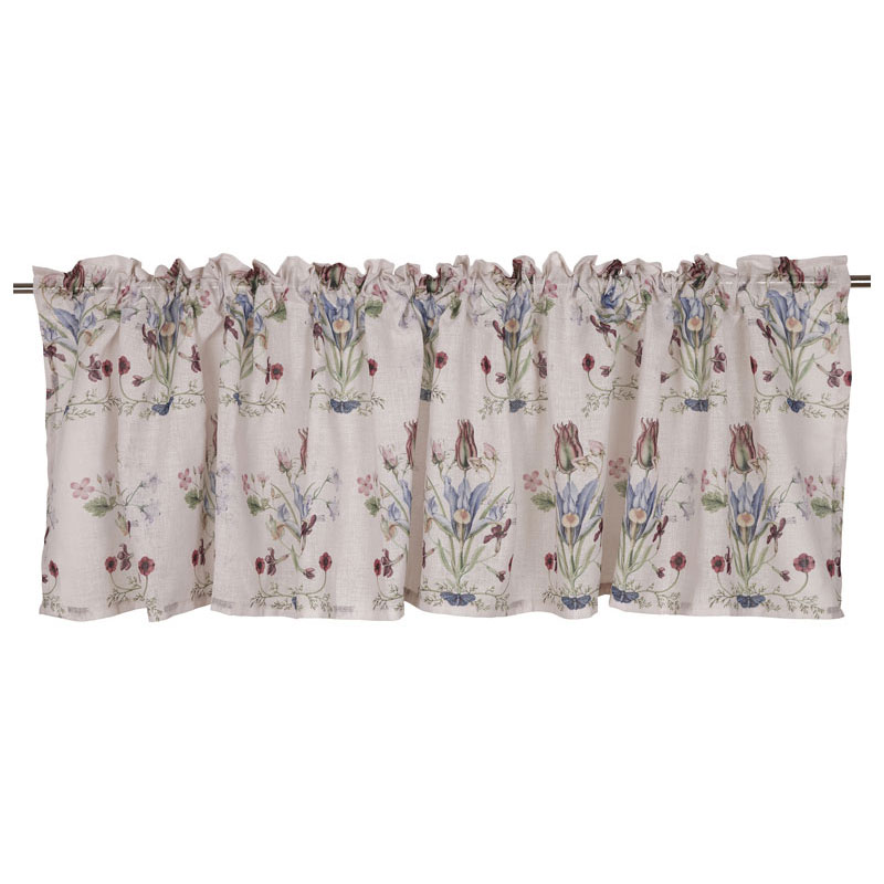 Vendela från Fondaco, skir gardinkappa med ett romantiskt, blommigt mönster på en sandfärgad bakgrund.