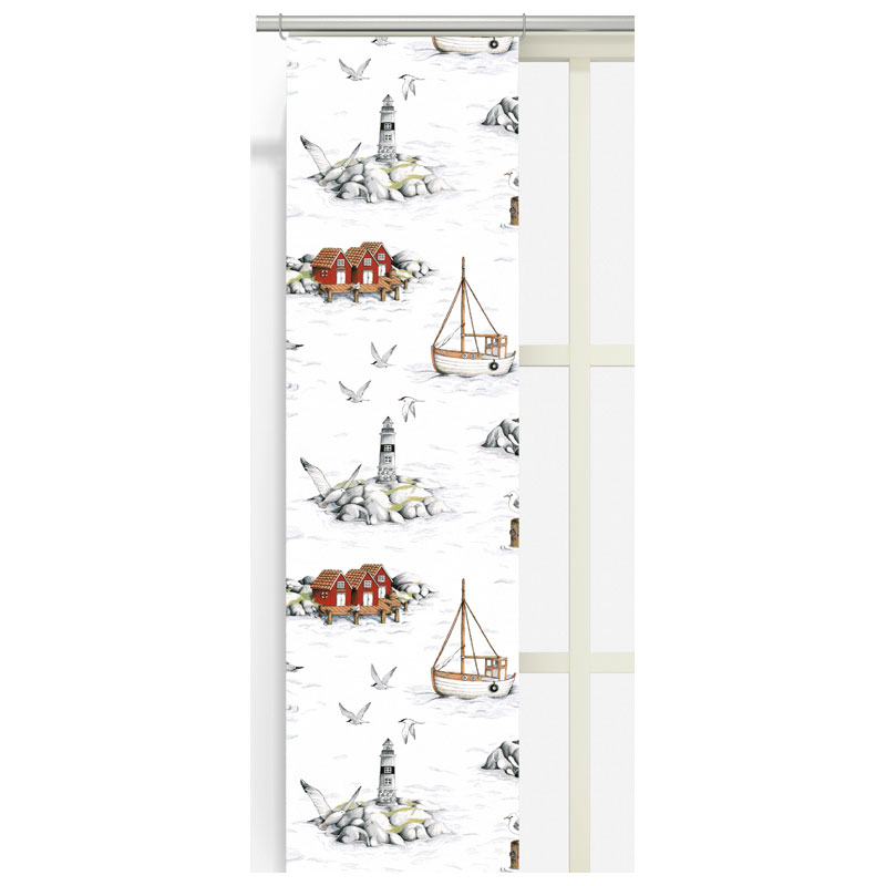 1Fiskeskär panellängder från Arvidssons, fin gardin med mönster av kusten i fräcka marinafärger.