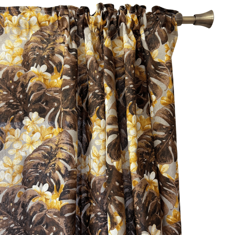 Gardinlängd Ixora från Ernst Textil, ett 2-pack med ett fint mönster av monstera i varma bruna nyanser. De ger hemmet en harmonisk och ombonad känsla.