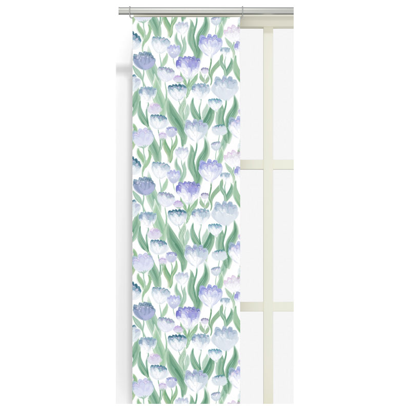 Charmiga panelgardiner från Arvidssons textil med ett ljuvligt blommönster i nyanser av blått, lila och grönt mot en vit botten.